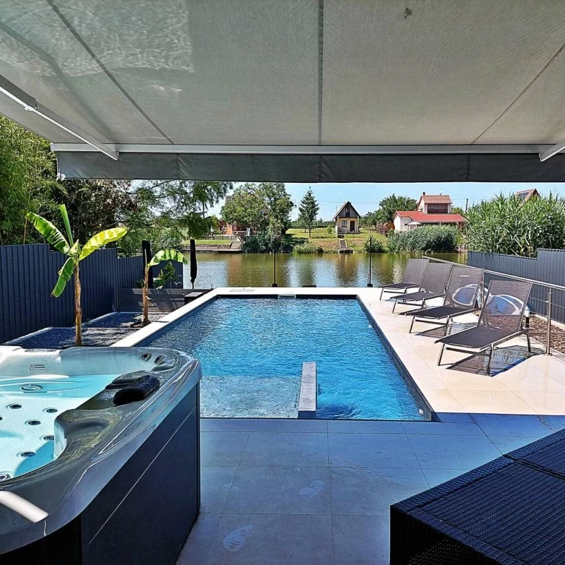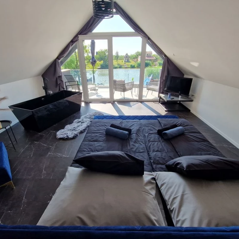 A vízparti, egész évben használható nyaraló 12 fő részére ideális, 5 hálóval és 4,5 fürdővel. Tágas nappali, jól felszerelt konyha, teraszos emeleti szobák (egy panorámás káddal) várják a vendégeket. A kertben jacuzzi, szauna, fűthető medence, grillező és játszótér található. Saját stég, csónak, SUP, bicikli és parkolás is rendelkezésre áll. Főszezonban (június 22. – augusztus 31. között) a minimum foglalások száma: 3 éj - 230.000 Ft/nyaraló/éj + 50.000 Ft egyszeri végtakarítási díj - min. 5 éjszaka foglalása esetén nincsen végtakarítási díj