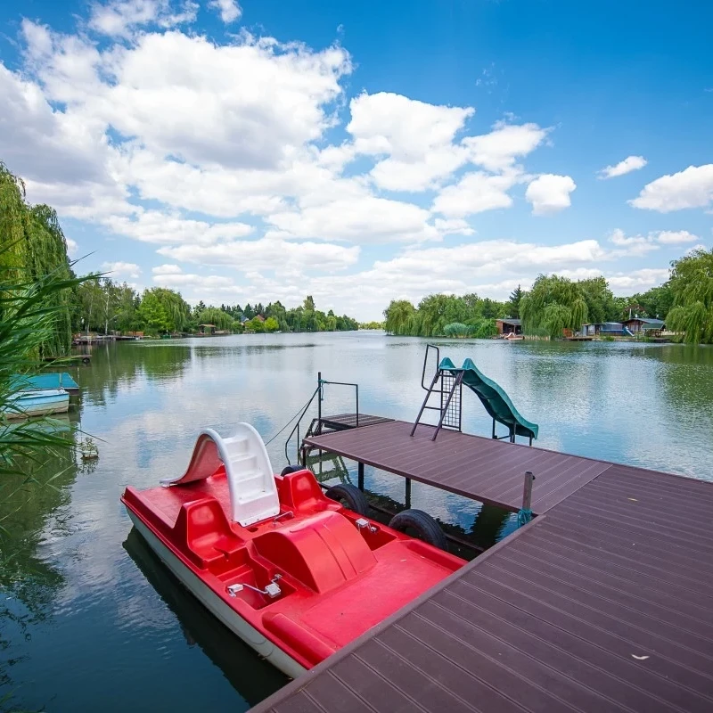 A 6+2 fős nyaralóban nappali, konyha és étkező egy térben van, 3 kisebb háló franciaágyakkal. A nappaliban kanapéágy és TV, a konyha jól felszerelt. Fürdő és WC egyben, klíma és fűtés biztosított, wifi, ágynemű, törölköző adott. Fedett teraszról lépcső vezet a kertbe, ahol udvari konyha, grillező és nagy vízparti rész található. Saját stég, kenu, vízibicikli és parkolás is elérhető, háziállat felárért hozható. Főszezonban (június 29. – augusztus 29. között) a minimum foglalások száma: 6 éj (hétfői érkezéssel, vasárnapi távozással) - 42.000 Ft/nyaraló/éj Ebben az üdülőben 2.500 Ft/háziállat/éj felár ellenében házi kedvencét is szívesen fogadjuk!