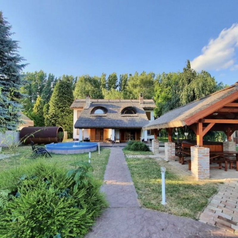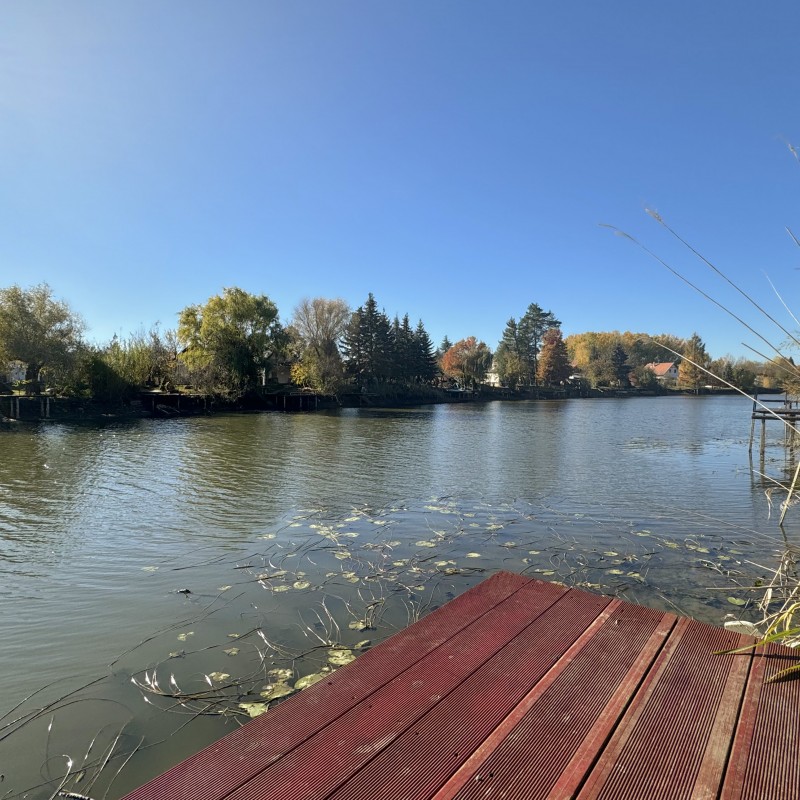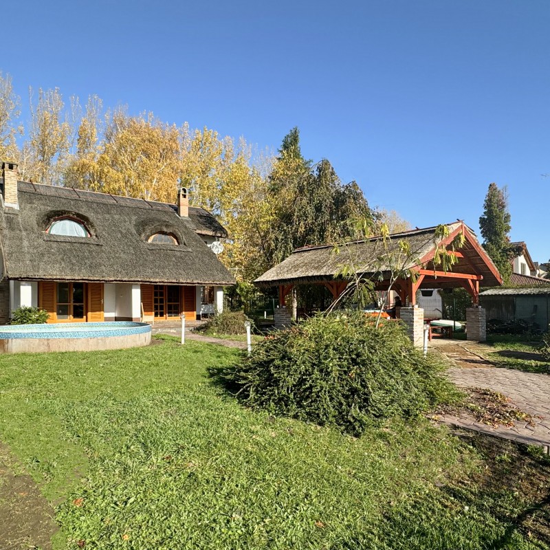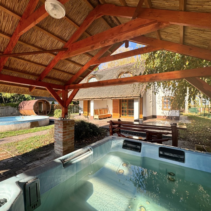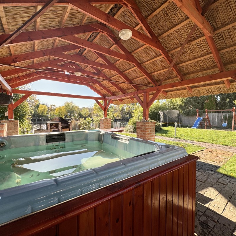 *A kertben: szauna, jakuzzi, medence, fedett kiülő, kis téglából kiépített sütő/főző hely, játszótér, vízpartot elzáró kerítés, két stég.