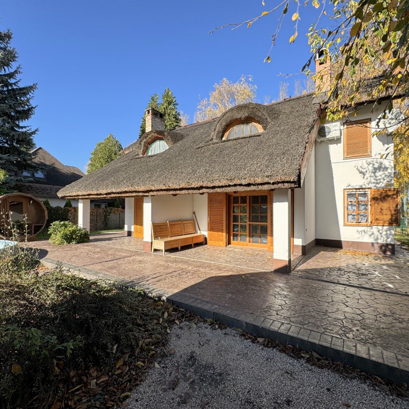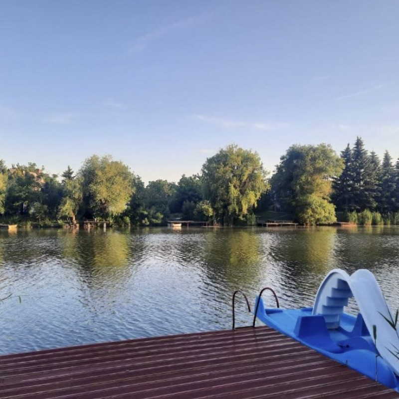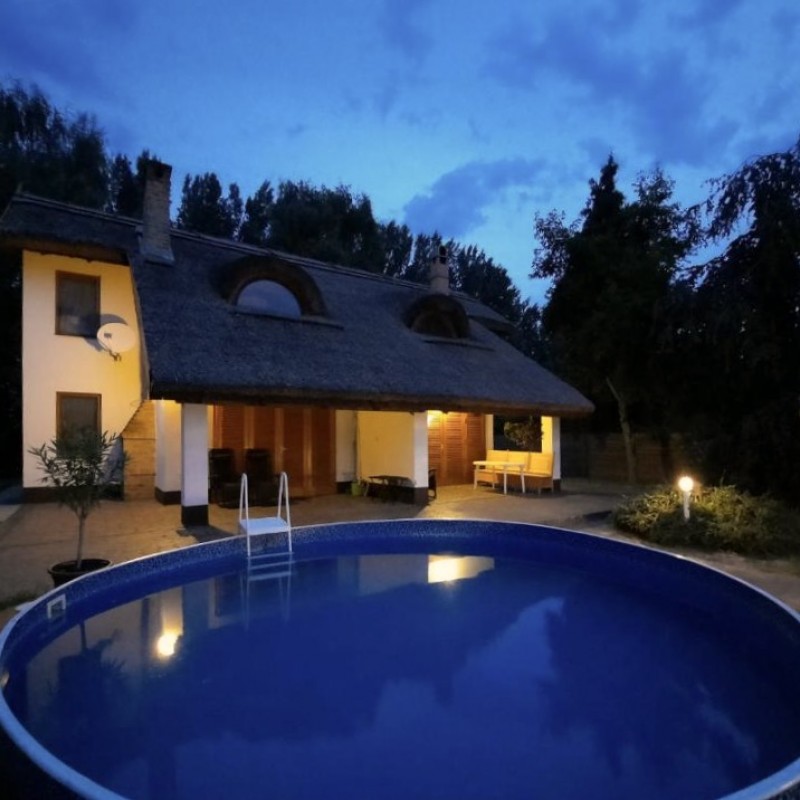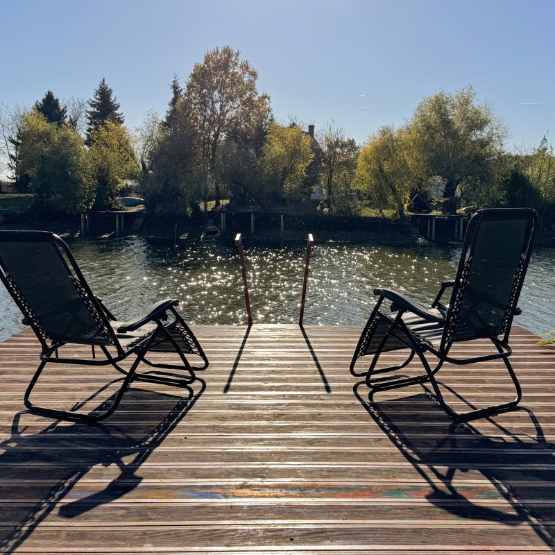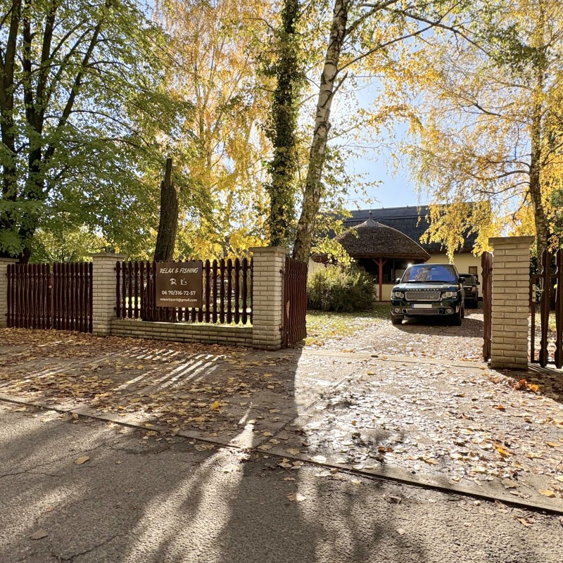 *A kertben: szauna, jakuzzi, medence, fedett kiülő, kis téglából kiépített sütő/főző hely, játszótér, vízpartot elzáró kerítés, két stég.