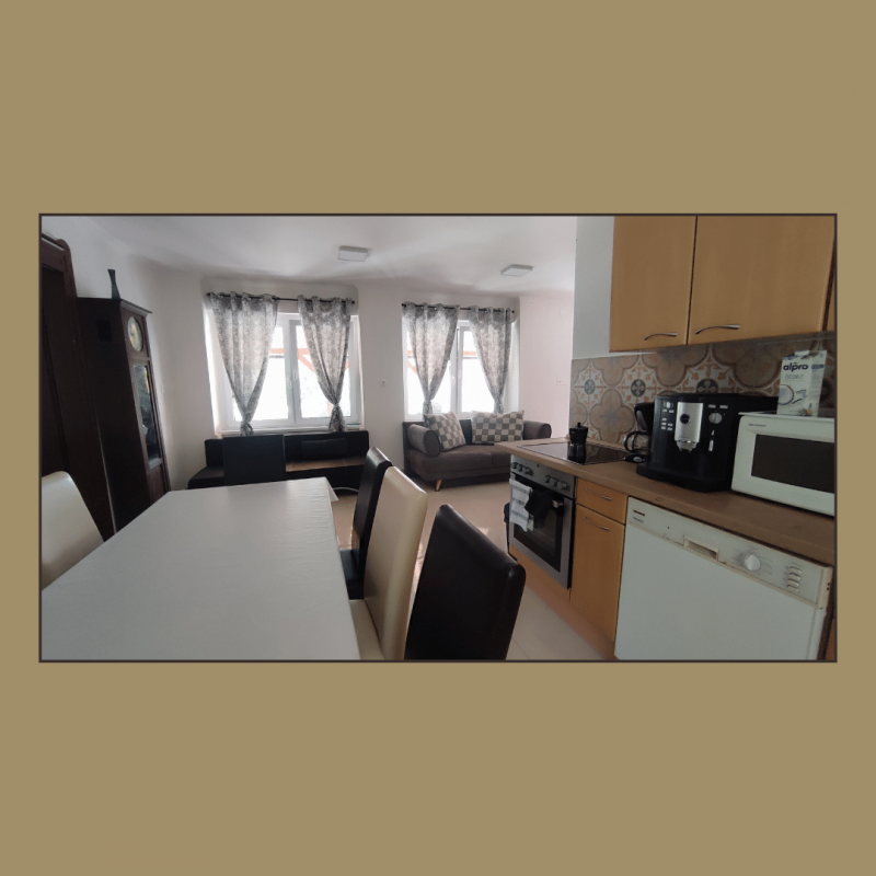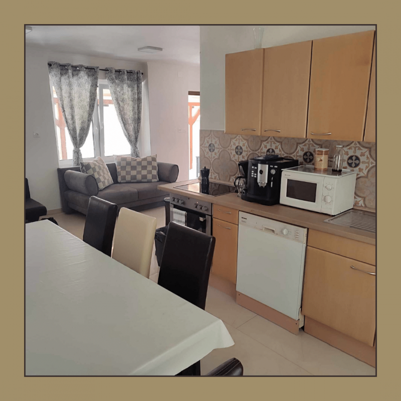 A hosszú gangos apartmanház két, ízlésesen és kényelmes bútorokkal berendezett apartmant kínál vendégeinknek, 3-3 szobával, mindkettő modern konyhával és fürdőszobával.
