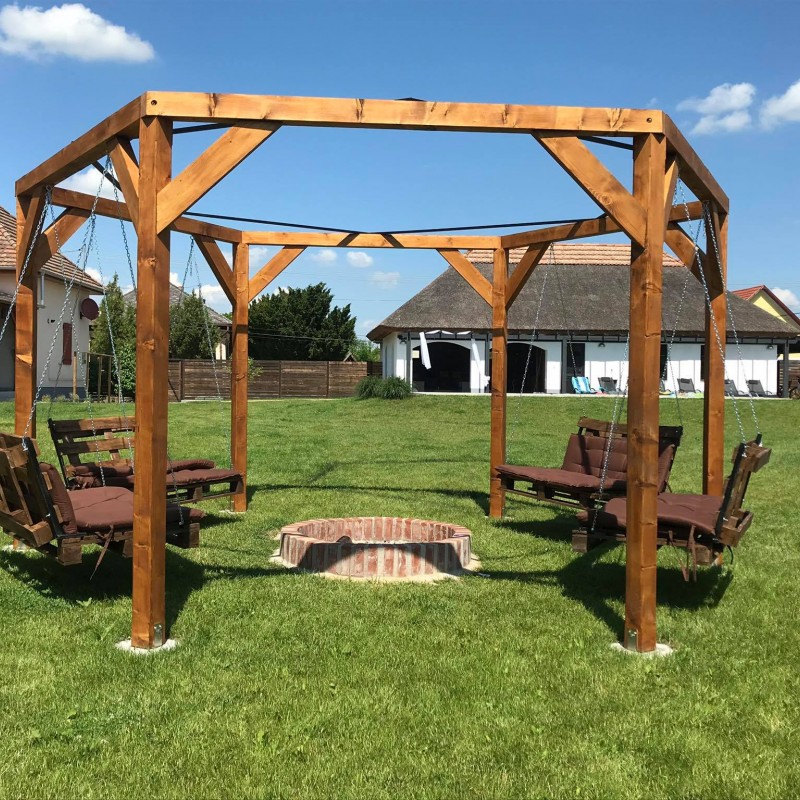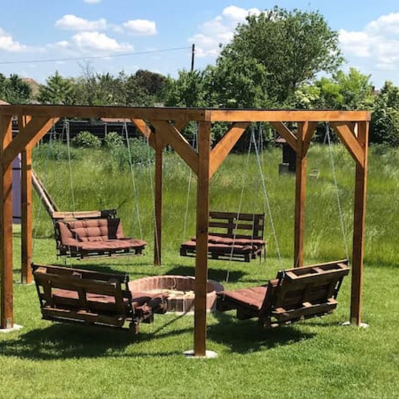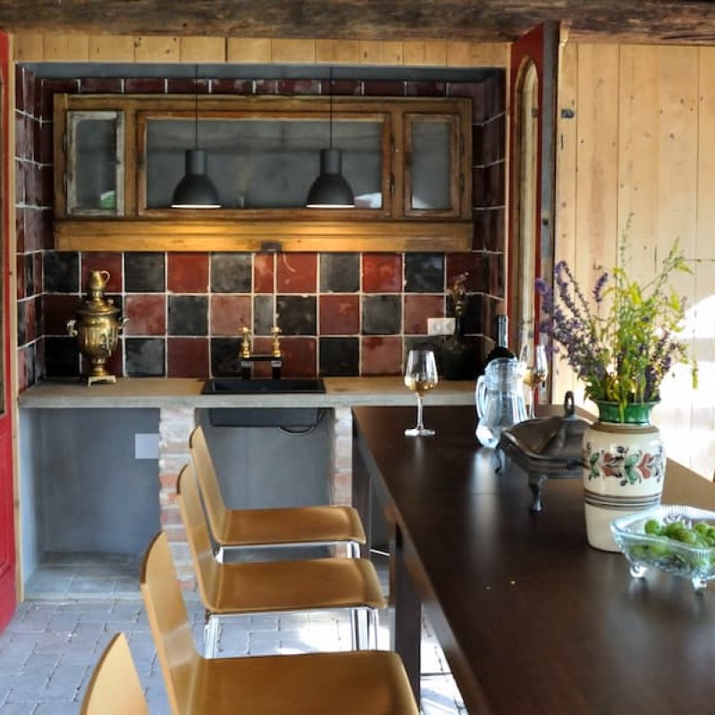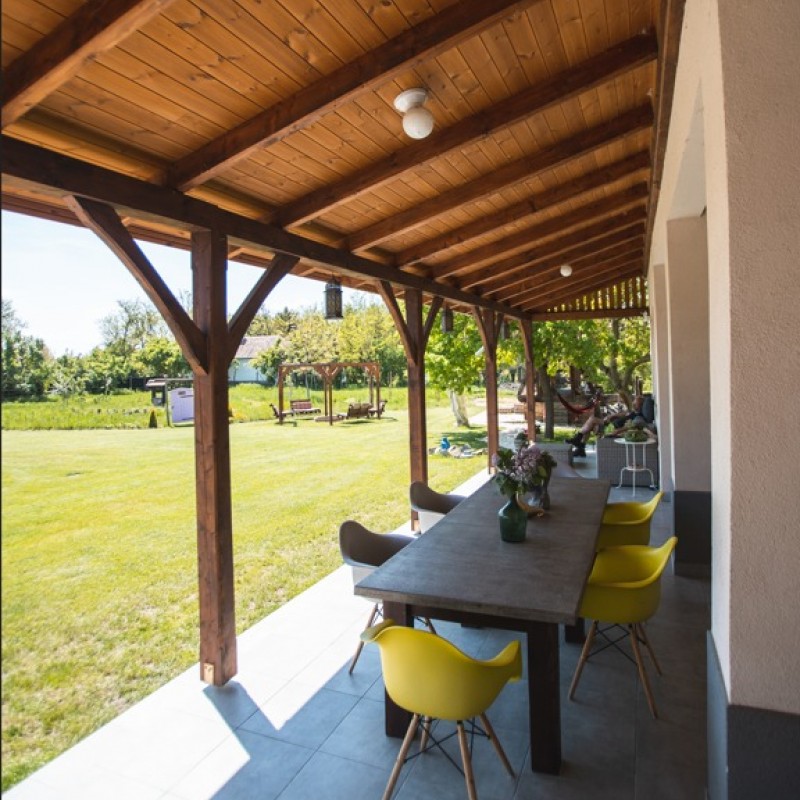 A tágas fedett terasz kényelmes ülőgarnitúrával és kinti nagycsaládos asztallal minden évszakban kellemes természetközeli nyugalmat áraszt.