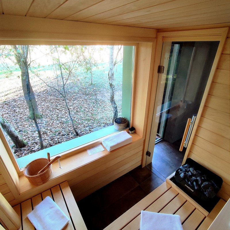 Ugyanebben az épületben kapott helyet a kombinált finn- és infra-szauna melyet a környező tájra néző panorámaablaka tesz egyedivé.