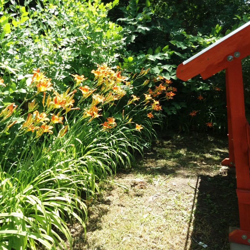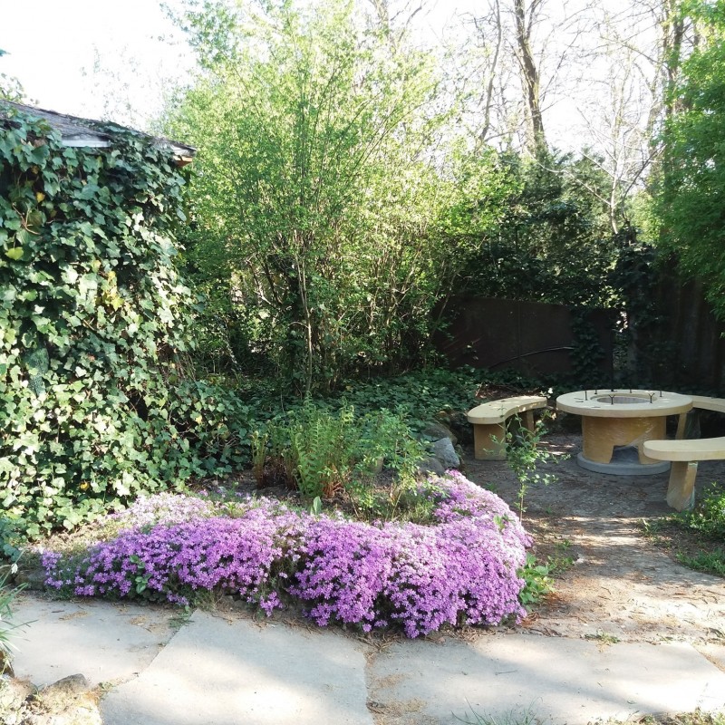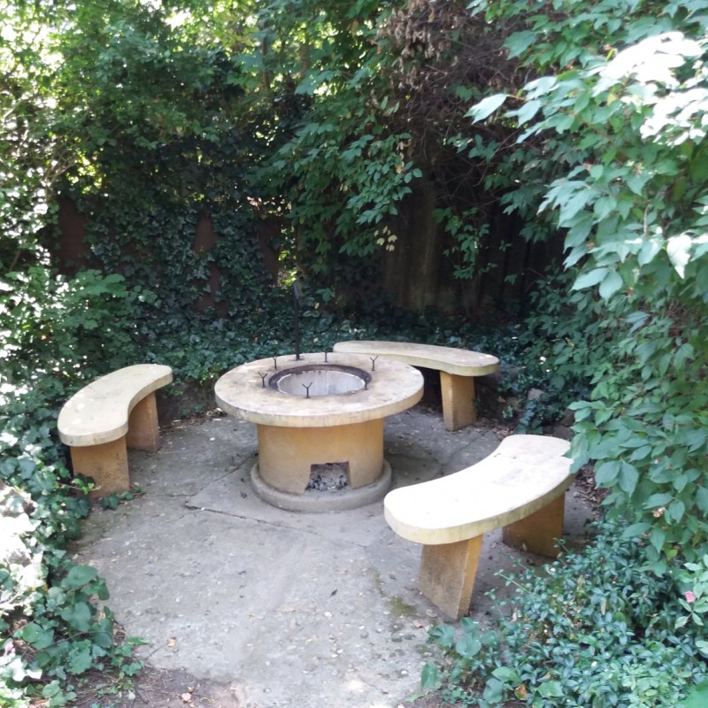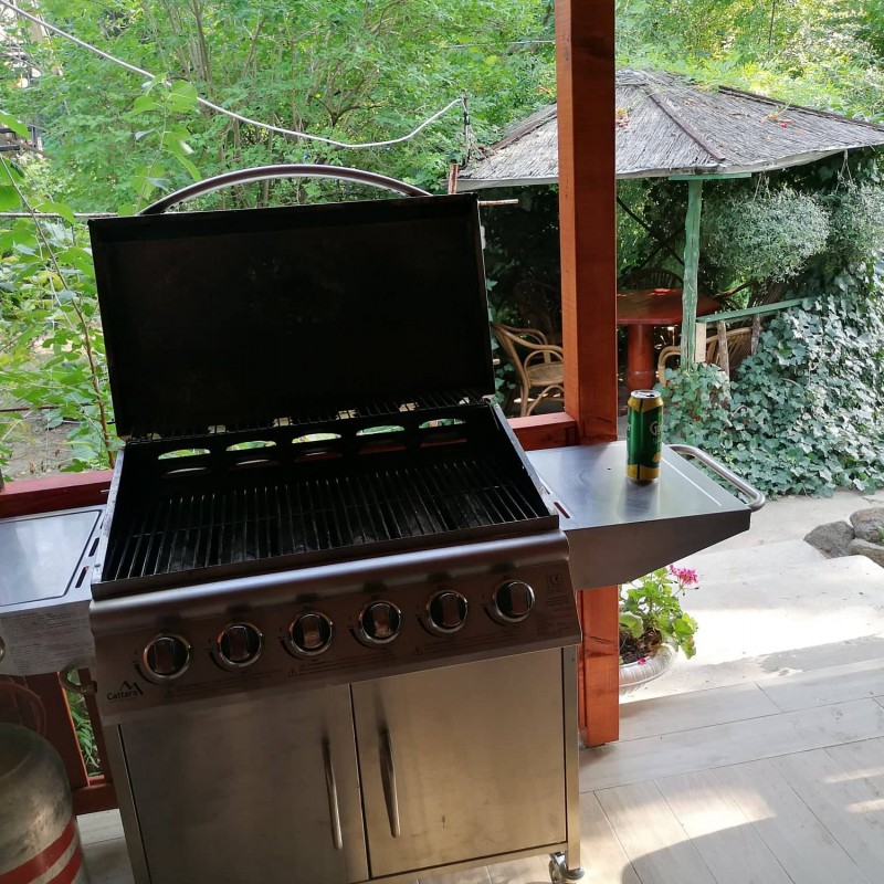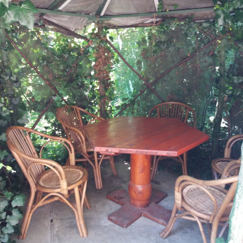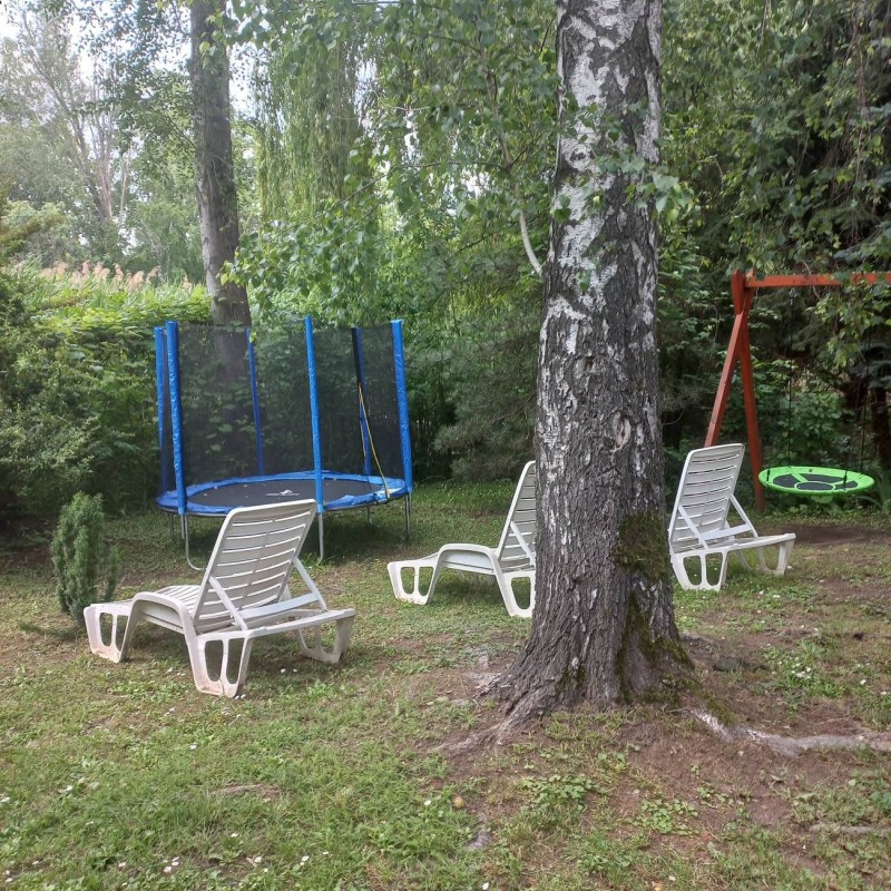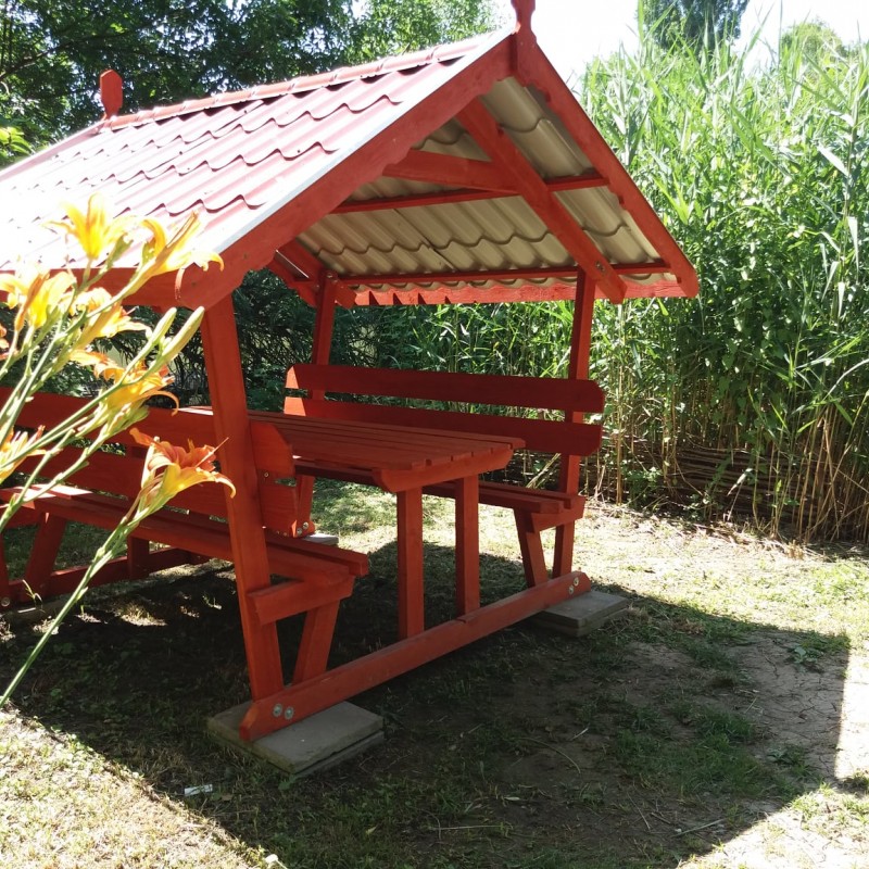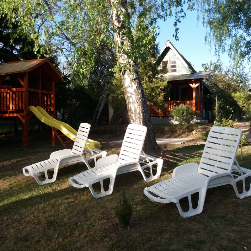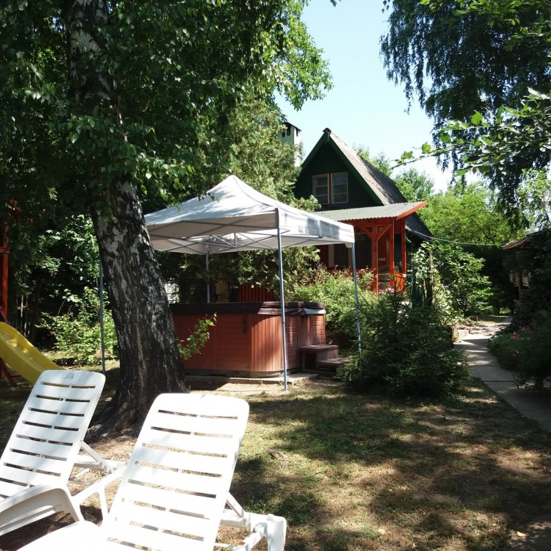 A kert szépen bevírágozott, parkosított, de nem egy sznob, modern parkot kell elképzelni, hanem egy vidéki "nagymami kertjét". Van egy borostyánnal szépen körbefuttatott 6 fős filagória, mellette egy kis kerti öbölben szalonnasütő, bográcsozó, de a nappaliból kilépve is egy szép nagy fedett teraszra jutunk, ahol a gázos grillkocsin elkészített ételeket is kényelmesen lehet elfogyasztani.