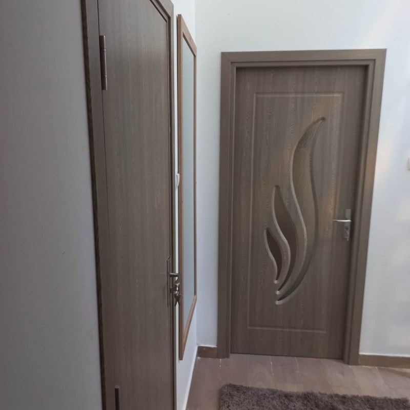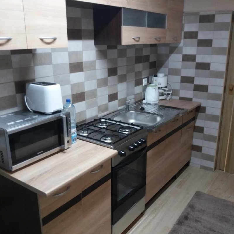 A nappali mellett helyezkedik el a minden technikával felszerelt konyha, melynek a végéből nyílik a fürdőszoba wc-vel, mosdóval, zuhanyzóval. A konyha előterében van a kombinált hűtő-fagyasztó szekrény elhelyezve.