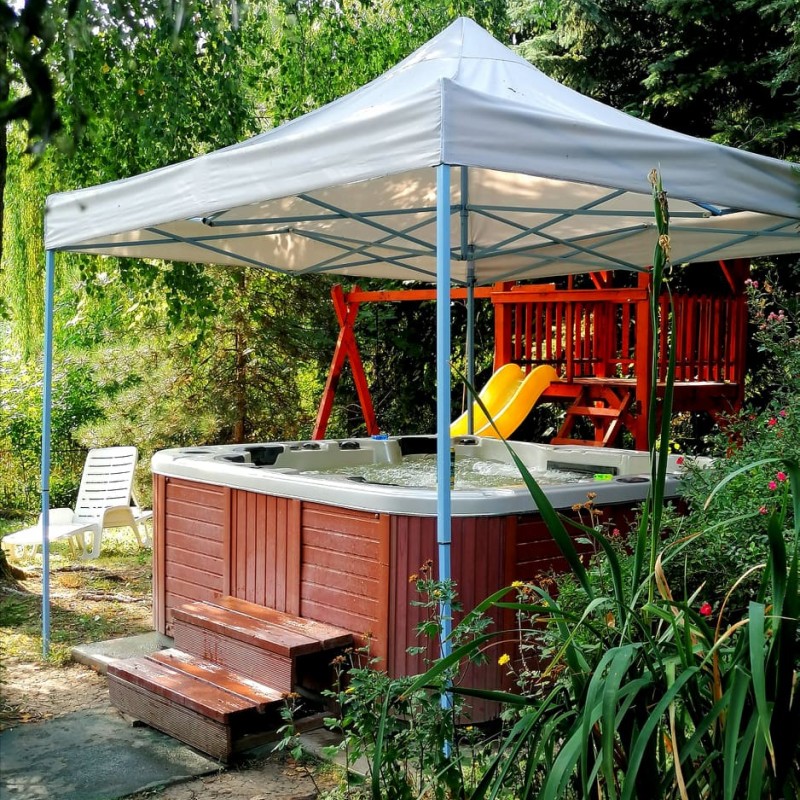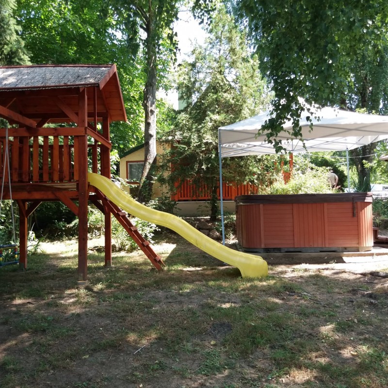 A fák árnyékában helyeztük el a gyerekek kedvelt játszóterét hintával, várral, csúszdával, melyet a jakuzziban ülve kényelmesen szemmel tarthatnak a szülők.