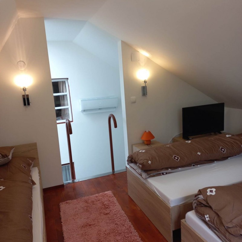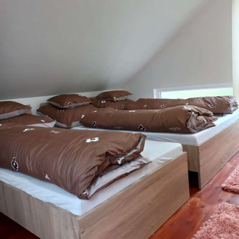 Egy új bővítés keretében 2023 májustól már +3 szobával és még egy fürdőszobával kibővültem fogadjuk vendégeinket. Ennek értelmében az új földszinti szobák 1-1db 2 fős franciaággyal és igény esetén szobánként +1-1 pótággyal állnak a vendégeink rendelkezésére. Az új szobák feletti galéria 1db franciaággyal, és 2db heverővel újabb 4 főnek ad szálláslehetőséget. (max 9fő az új részlegen) Az új szobák LED okos TV-vel és elektromos fűtőpanelekkel felszereltek. Nyári hűtésükről a közlekedőben felszerelt hűtő-fűtő klíma gondoskodik.