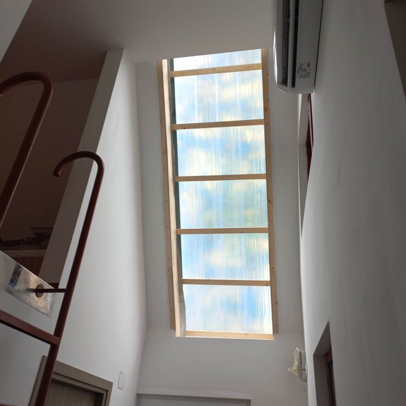 A tetőtérbe a nappaliból lehet feljutni, ahol kettő hálófülke lett kialakítva, két-két heverővel, éjjeliszekrénnyel, és TV-vel felszerelten. A tetőtéri feljáróba került felszerelésre egy inverteres klíma, mely a ház hűtését-fűtését hívatott biztosítani.