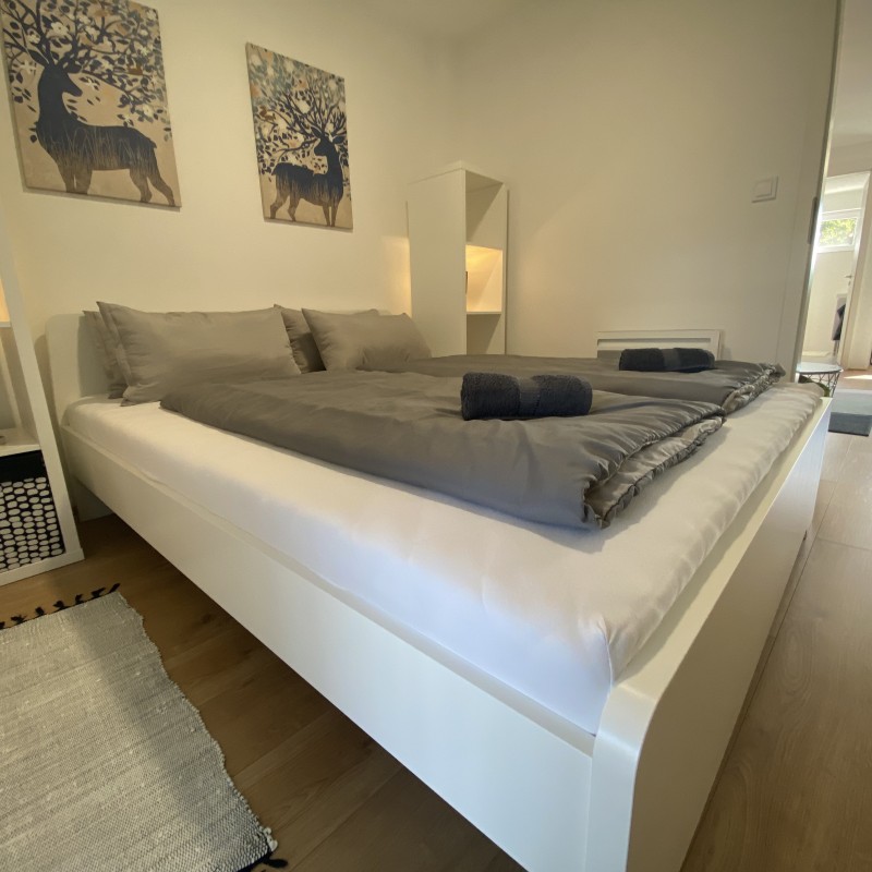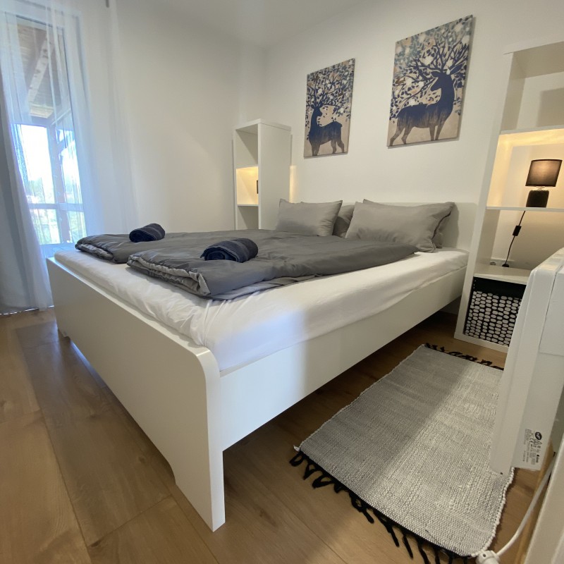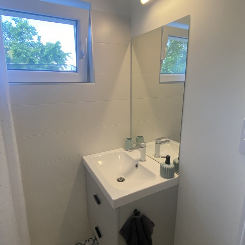 kerültek elhelyezésre (+ kávéfőző, vízforraló, kenyérpirító). A nappali részből nyílik a franciaágyas
