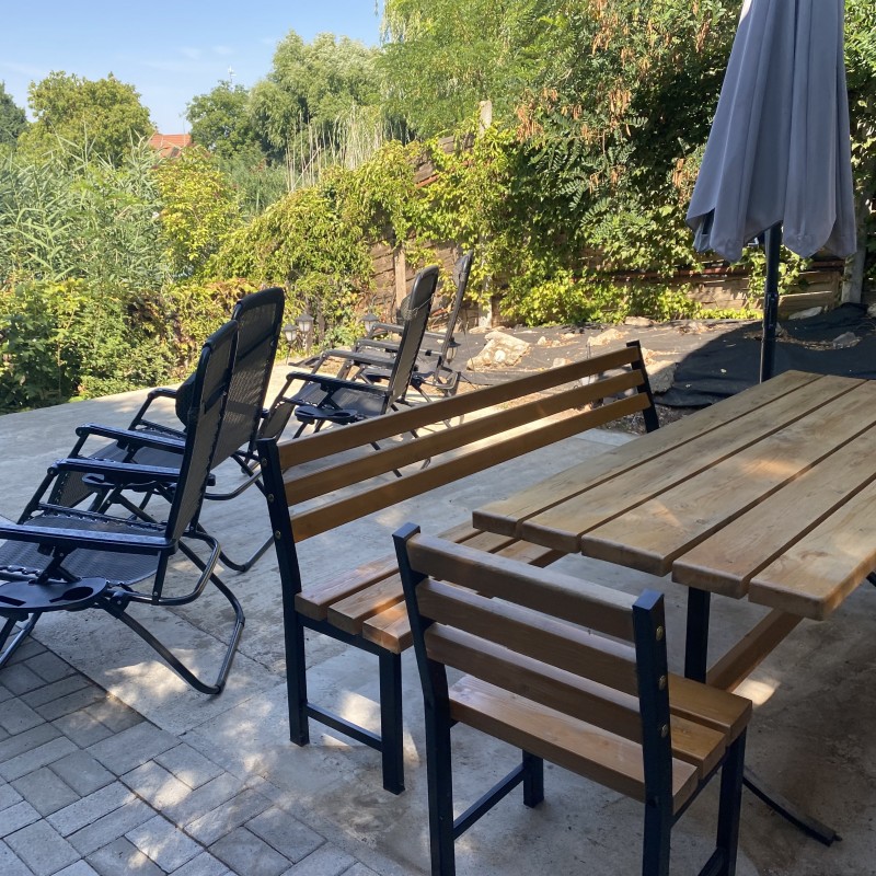 Az alsó teraszon társasági étkezésre, beszélgetésre alkalmas kerti kiülő áll rendelkezésre a vendégek