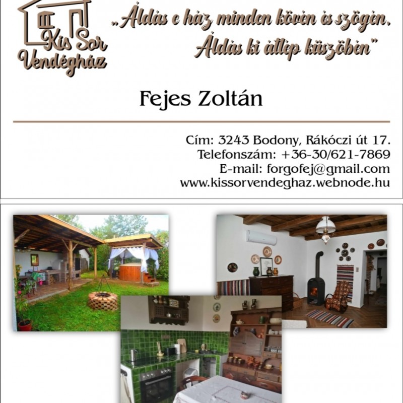 Sok szeretettel várunk benneteket a Kis Sor Vendégházba a Mátra lábánál található kis faluba Bodonyba. Ingyenes dézsafürdő használattal. Kemencével, grillezővel, szalonnasütővel.