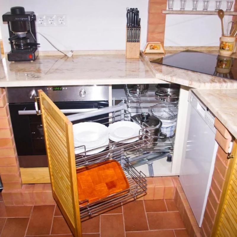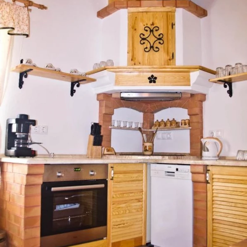 A kényelmet a teljesen felszerelt konyha: villanysütő, főzőlap, mikrohullámú sütő, kávéfőző, kombinált hűtő, vízforraló, mosogatógép szolgálja.