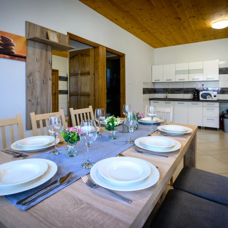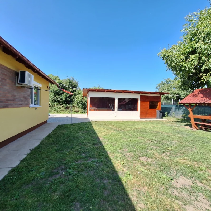 Az udvaron kialakításra került egy szauna-és jacuzzi ház, ahol van még egy tusolós fürdőszoba wc-vel, egy mosogató, kis hűtő és egy 8 személyes étkező garnitúra.