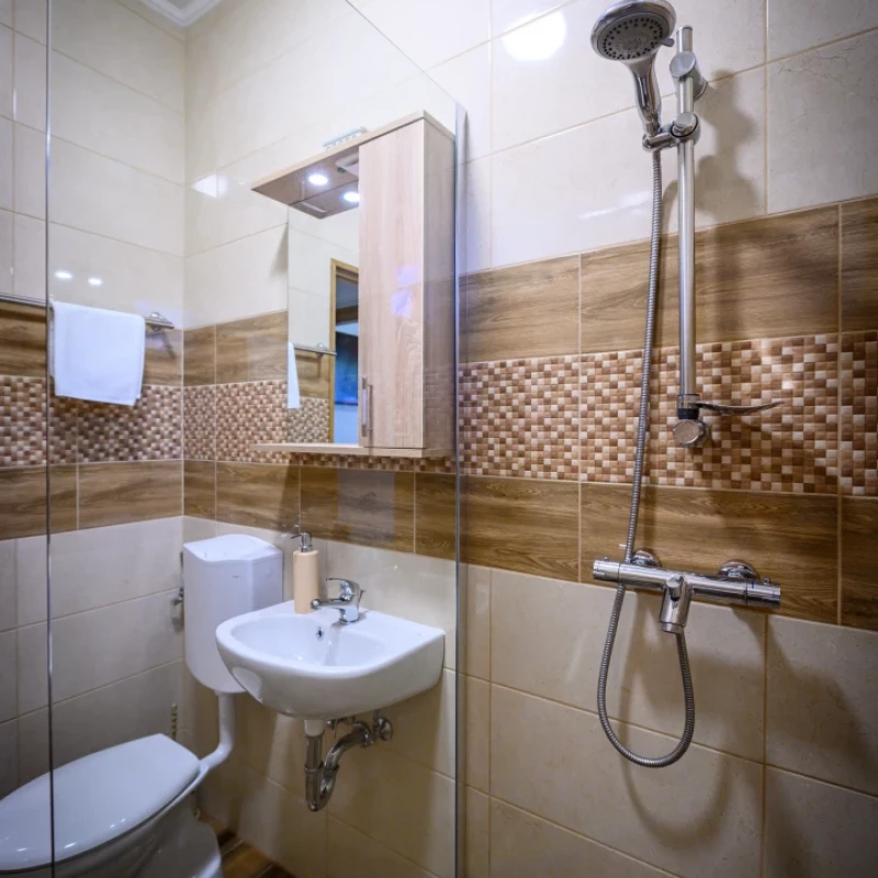 Minden szobához külön tusolós fürdőszoba tartozik wc-vel.