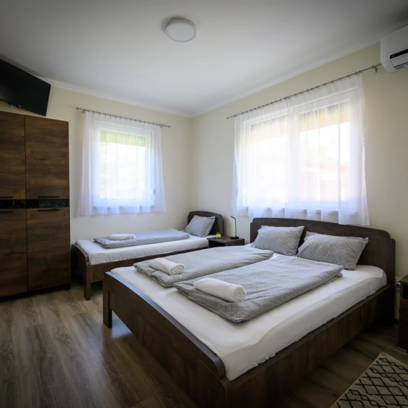 2 db szoba franciaággyal+1 egyszemélyes ággyal.